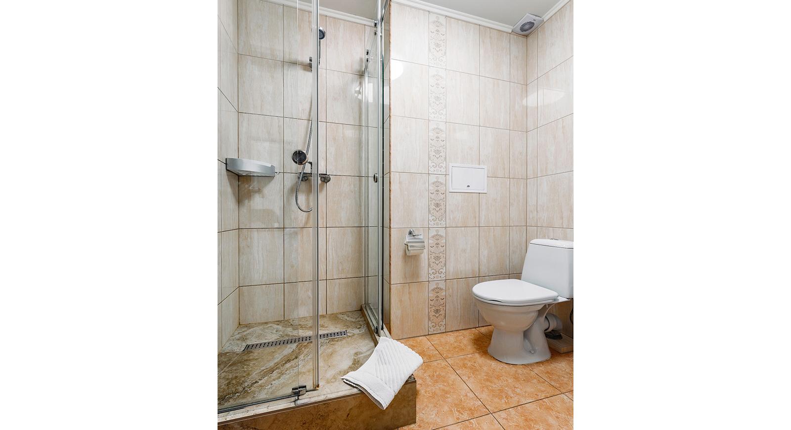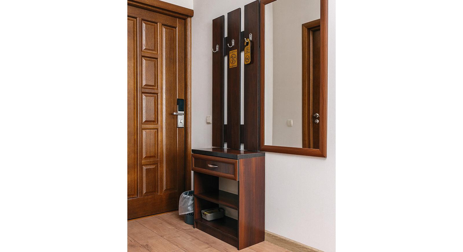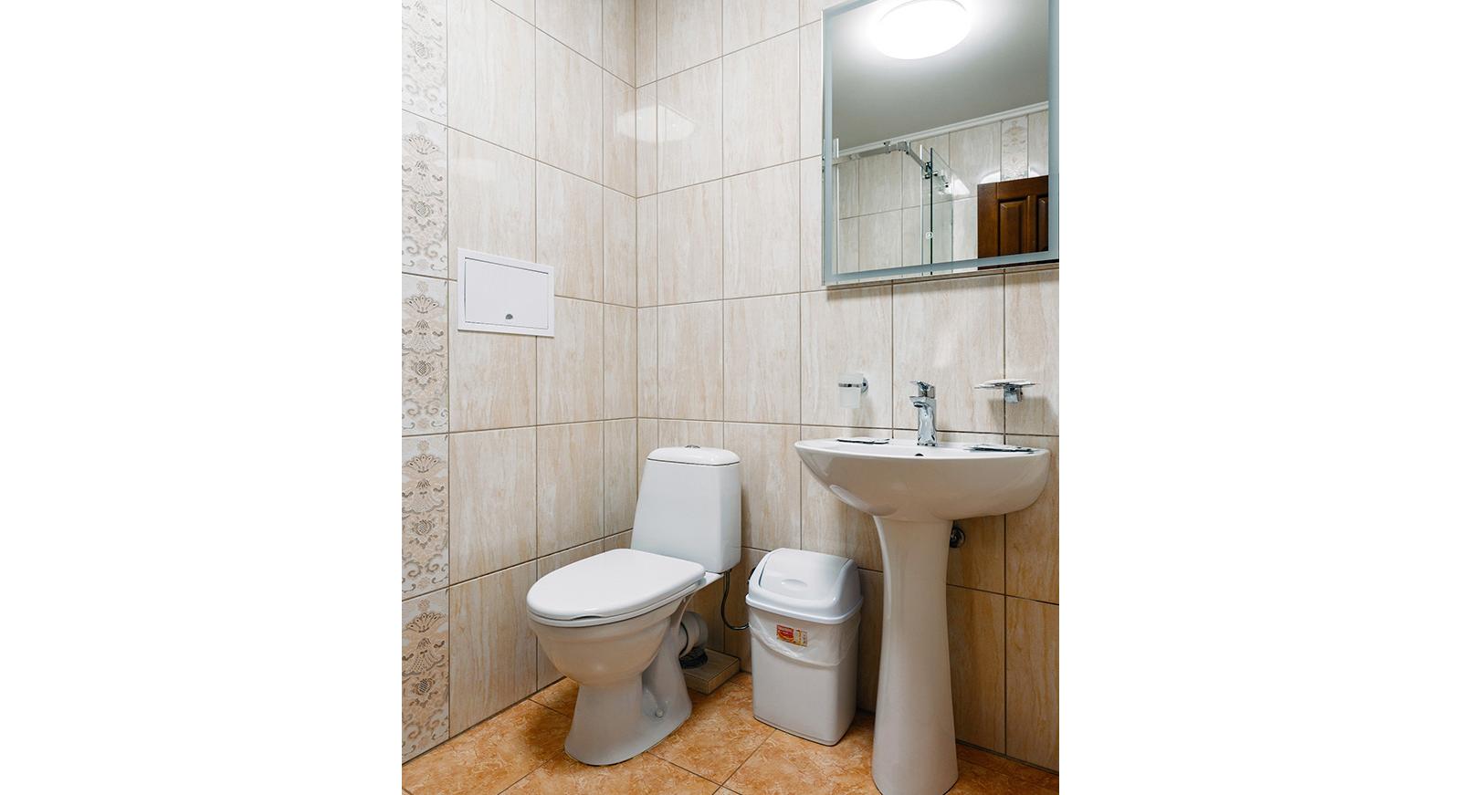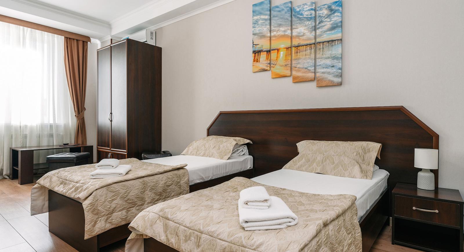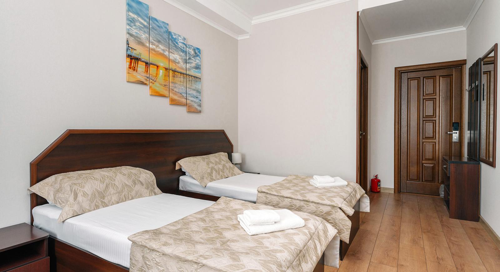 В просторном номере гостевого дома Симферополя "Oscar" могут с комфортом расположиться четверо взрослых или семья с ребенком: в комнате есть две раздельные кровати и раскладной диван.